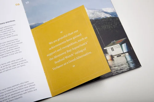 With an eye to provide salmon for seven generations—Verlasso is fundamentally changing the way Salmon is farmed. Their unique harmony of efficient farming and environmental consciousness is at the foundation of the brochure we created to help them tell their story.
